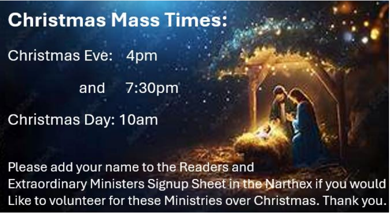 Suzy fund would like to wish all Parishioners a peaceful and happy Christmas. Thank you for all your donations throughout the year. If you would like to give an extra donation over Christmas, please place in an envelope in the Suzy Collection box/ parish office with your name and we will send out New Year greetings